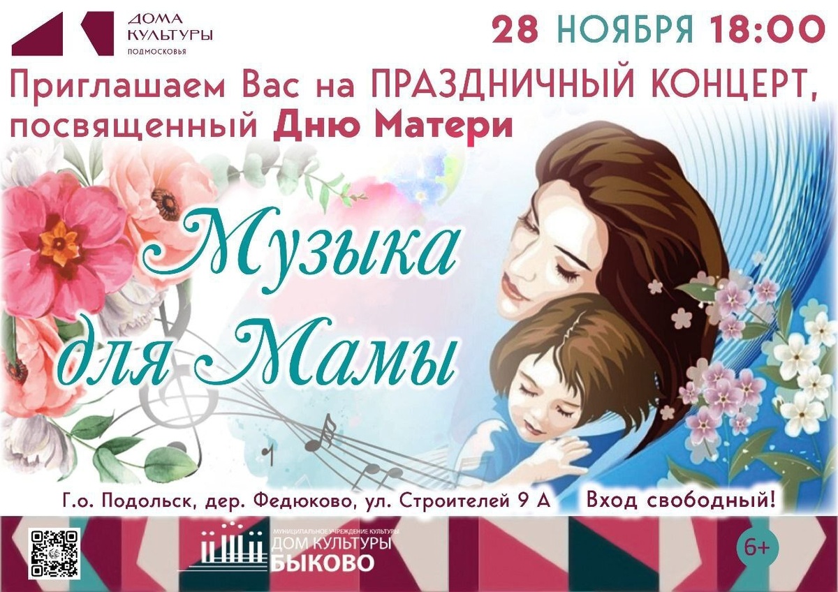 ✨ Концерт «Музыка для мамы» 🎵 📢Самый тёплый и душевный праздник осени! Приглашаем вас на концерт, посвящённый нашим самым дорогим — МАМАМ! 🩷В программе: любимые песни, трогательные стихи и танцевальные номера от наших талантов! 🏢 Дом культуры д. Федюково 📍г.о. Подольск, д. Федюково, ул Строителей 9А, 🚫 Возраст: 0+ 📆 28.11.2025 🕒 18:00 💰 Вход свободный❗️ ⭐Поддержать канал голосом 🍰Где поесть в Подольске ✅ Мероприятия Подольск https://dzen.ru/id/66ed500f7b5671493eca3fd6 http://vk.com/podolsk_events http://dzen.ru/podolsk_events