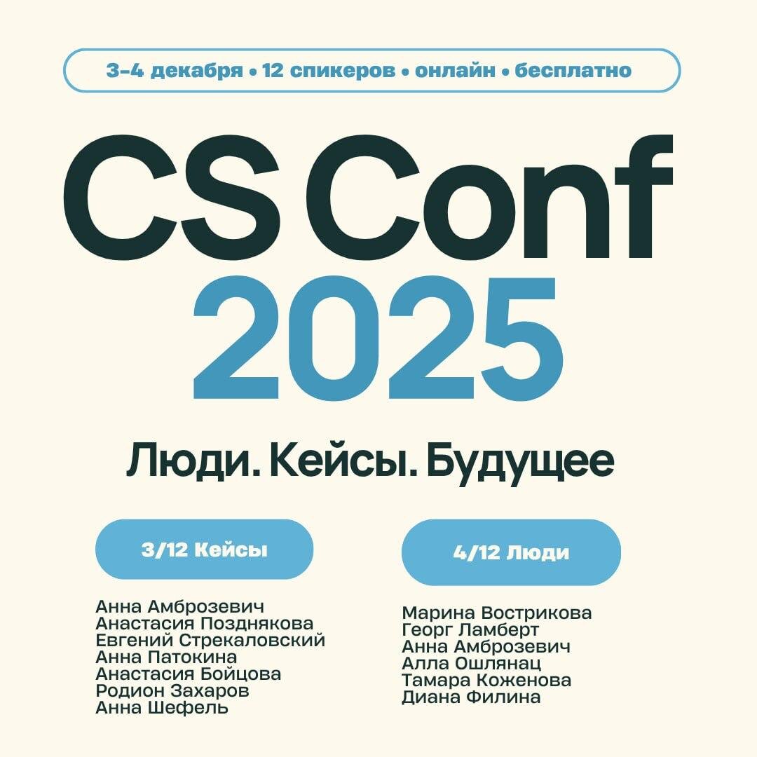 CS Conf 2025 Люди. Кейсы. Будущее Моя коллега, Марина Вострикова, в соавторстве с Анной Амброзевич во всю трудятся над организацией конференции про Customer Success. Причём сразу на два дня: 3 декабря — разбирают кейсы, 4 декабря — говорят про людей. Если почитать программу второго дня конференции, можно заметить в спикерах и меня! Да-да, вписался в тренд. Конец года — самое время сделать короткий срез, разобрать, что происходит, и прикинуть, каким может быть 2026-й 😇 Делаем камерное исследование под моё выступление, чтобы разобрать рынок 2026 глазами HR: куда движется CS и что нужно людям и компаниям. Так что, если вы по Customer Success, приходите на всю конференцию! Доклады огонь, обещает быть жарко и интересно! Полная программа конференции на сайте: https://nochurn.ru/csconf А если не в теме, 3-го декабря в 17:10 по Москве, ровно через неделю, можете просто заглянуть на 20 минут: посмотреть моё выступление и по-ламьи поддержать 🥰 Для участия в конференции не нужно регистриро