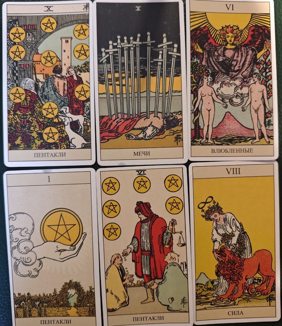 Карты: 10 Пентаклей, 10 Мечей, Влюблённые, Туз Пентаклей, 6 Пентаклей, Сила.