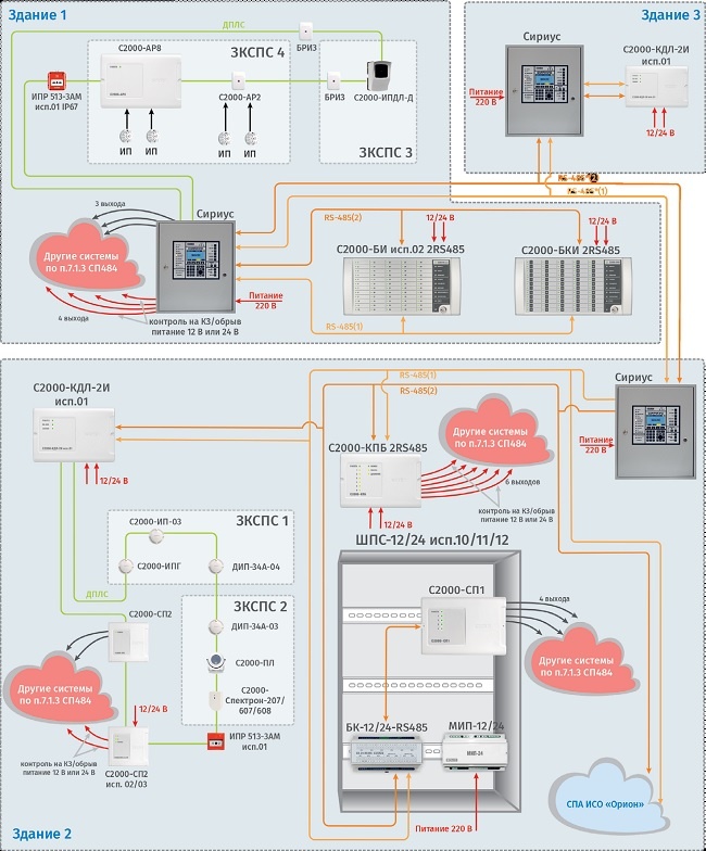 Также количество выходов может быть расширено при помощи релейных блоков «С2000-СП1», «С2000-СП1 исп.01», «С2000-КПБ 2RS485», а система дополнена блоками индикации «С2000-БИ исп.02 2RS485» и «С2000-БКИ 2RS485» по аналогии с неадресной распределенной и адресно-пороговой СПС.