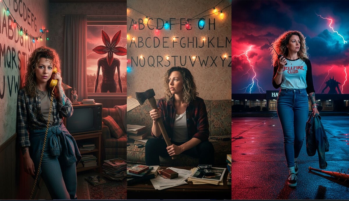 Создайте мой портрет в стиле 2000-х годов в доме, вдохновленном сериалом «Очень странные дела», доме Уилла, с алфавитом, нарисованным черной краской на стене, и над каждой буквой — серией цветных рождественских огней с лампочками над каждой буквой. Интерьер представляет собой дом в пригороде небольшого городка с мягким, приглушенным освещением и тенями. Мягкий, но с тонким кинематографическим сновидческим блеском. Я прислоняюсь к стене с желтым телефоном, у которого оборванный провод у моего уха. Одежда и внешний вид: прическа в стиле 80-х, я ношу обычную одежду подростка 1987 года, вдохновленную сериалом «Очень странные дела»: джинсы с высокой талией, футболка, куртки или свитера в несколько слоев в приглушенных цветах того времени. В окне виден высокий и худой монстр, голова которого состоит из красных лепестков, есть 4 лепестка, а в центре видны зубы, как в сериале, он скрывается, частично скрытый в тени, создавая тревожную и напряженную атмосферу, не нужно закрывать лицо. Декор и реквизит: комната имеет аутентичный декор 80-х годов: обои с узором, ретро-мебель, одеяло на диване, старый телевизор с ЭЛТ-экраном, стопки книг или журналов 80-х годов, небольшие ностальгические украшения на полках, выцветшие постеры поп-культуры 80-х на стенах, снаружи кажется, что падают красные лучи, не меняйте мое лицо.