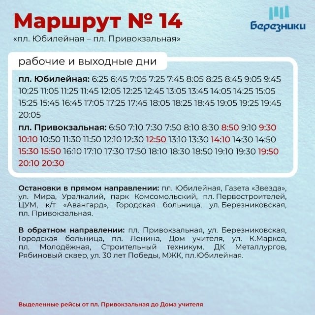 🚌Актуальное расписание маршрута №14 «пл. Юбилейная - пл. Привокзальная»