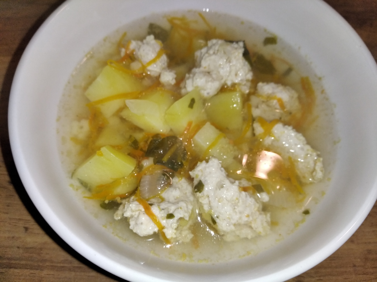 С вечера достала куриную грудку из морозилки, примерно 800 грамм, к утру она разморозилась, готовлю. Сначала смешала все ингредиенты для манника, и поставила в духовку. Сегодня у меня пирог с брусникой. Рецептом делилась здесь: Поставила кастрюлю четырех литровую на плиту, буду варить суп, в ней половина воды. Далее взяла примерно 300 грамм капусты, измельчаю в кухонном комбайне, пока капуста измельчается, почистила и нарезала лук сюда же и в суп ( кубиками). В суп же добавила морковь из морозилки ( уже натертая на мелкой терке). Еще успела промыть рис примерно сто пятьдесят грамм. В комбайне следом за капустой измельчаю грудку до состояния фаша, предварительно капусту с луком и рис переложила в глубокую миску. Фарш готов, грамм сто пятьдесят я отложила на суп, остальное забрала на ленивые голубцы, добавила к капусте и рису. Сюда же добавила соль, кориандр и уцхо-сунели, все перемешала, налепила шарики диаметром по пять сантиметров и отправила в сковородку поджариться на среднем огне н