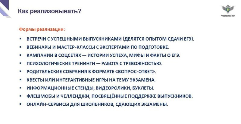 Формирование позитивного отношения к ЕГЭ считают в Рособрнадзоре «стратегической целью всей образовательной системы нашей страны» Хотя тем самым и признают, что сейчас с «позитивным отношением» существует масса проблем Как, впрочем, и все годы существования ЕГЭ, хотя, казалось бы, цель такую следовало ставить в самом начале Теперь работать на достижение цели призывают всех — школьников, родителей, педагогов, выпускников Кто-то должен делиться успешным опытом сдачи ЕГ, кто-то устраивать квесты и интерактивные игры на тему экзамена, кто-то организовывать онлайн-сервисы, кто-то проводить кампании в соцсетях (интересно — кто?) Ну и т.д. Представлено всё это в виде «инициативного» проекта, который может быть предложен школой, педагогами, родителями, ученическим советом и т.д. Так что для реализации «стратегической цели» федеральное ведомство предлагает проявлять «инициативу снизу» — в соответствии с разработанными сверху методическими указаниями