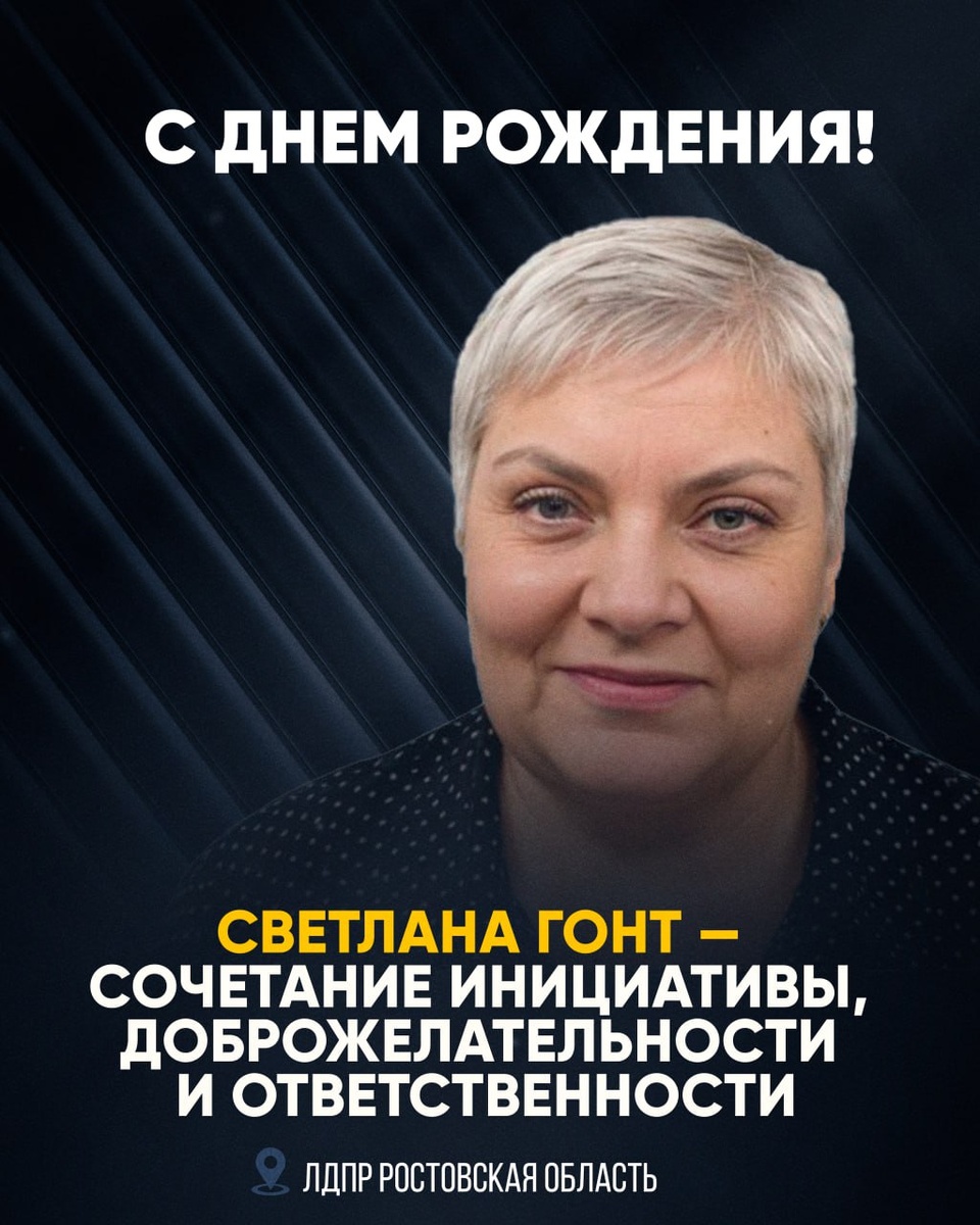 С Днём рождения! 💠 Сегодня мы поздравляем нашу коллегу Светлану Гонт — активного, инициативного и отзывчивого человека, на которого всегда можно положиться. Светлана — пример ответственности, вовлечённости и искреннего отношения к людям, а её труд вносит значимый вклад в общую работу команды. ✨✨✨Ростовское региональное отделение ЛДПР поздравляет Светлану Гонт с Днём рождения и желает: крепкого здоровья, тепла, благополучия и надёжной поддержки близких. 💠 Пусть каждый день будет наполнен вдохновением, новыми возможностями и уверенным движением вперёд. Пусть рядом всегда будут люди, которые ценят, уважают и помогают идти к своим целям. Дорогие подписчики, благодарим Вас за поддержку! Ваши реакции, приглашения друзей и репосты позволяют нам развиваться. Не забывайте ставить 👍👍👍