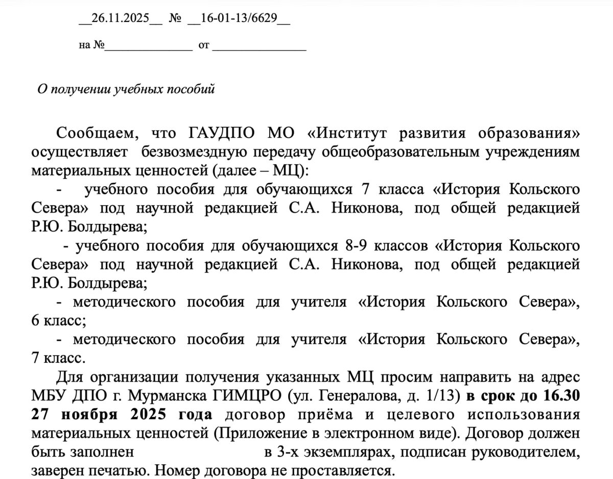#Поговаривают, что в городские школы пришла разнарядка в срочном порядке получить учебные и методические пособия для 7-9 классов «История Кольского Севера». «В срочном порядке» означает, что это нужно было сделать практически вчера (письмо датировано 26 ноября со сроком исполнения 27 число). Вот интересно, а по какому учебнику изучали историю родного края до сих пор? И что будет с этим – пляже грузом в школьные библиотеки? Письмо (имеется в распоряжении «АО») подписано начальником отдела общего образования Светланой Корневой (той самой, которая уверяла родителей, что после увольнения директора гимназии № 1 Марины Чистяковой ничего не изменится). ❄ «Арктический Обозреватель»