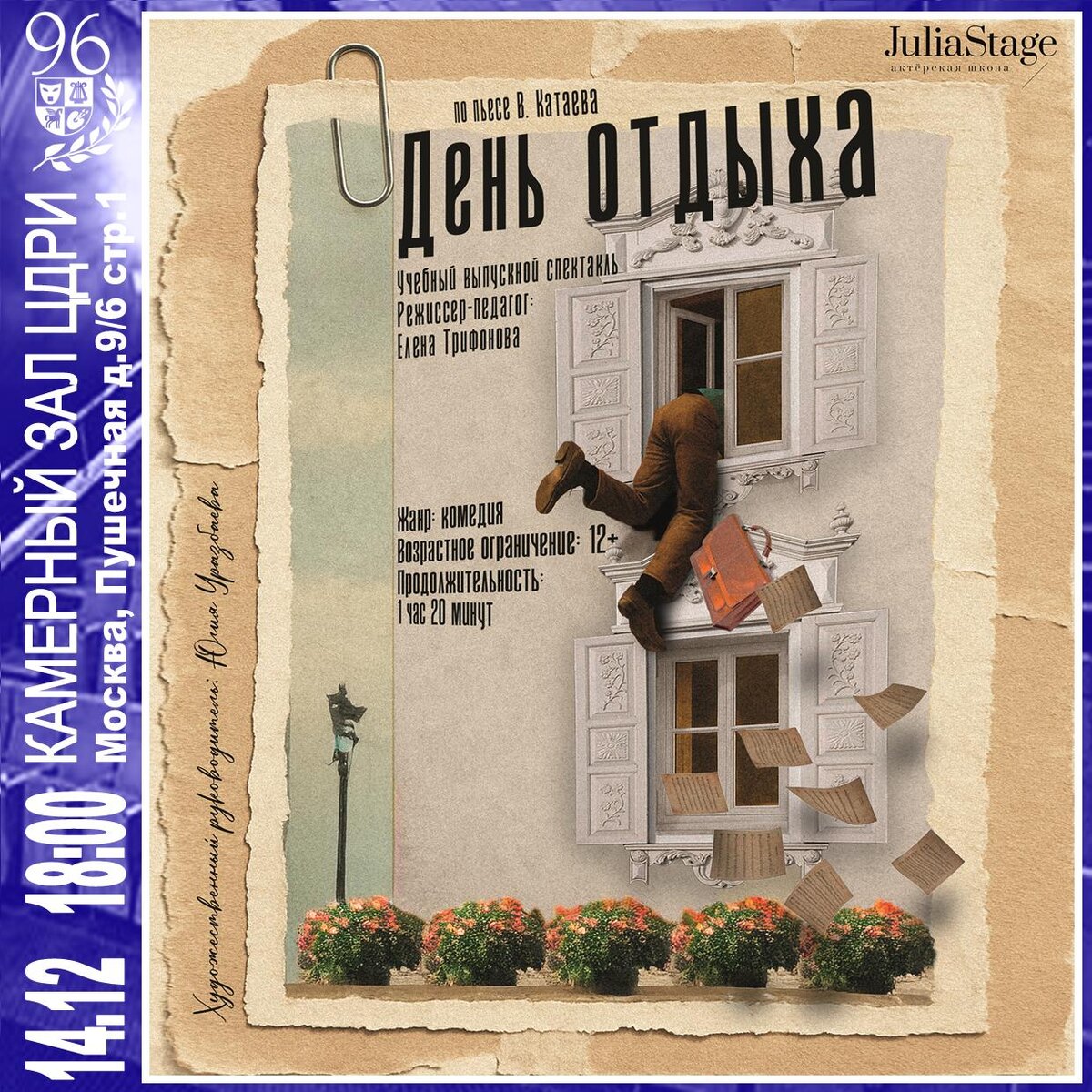 Учебный выпускной спектакль «День отдыха» по пьесе В. Катаева Спектакль «День отдыха», поставлен по одноимённой комедии положений Валентина Катаева. Герои спектакля, по тем или иным причинам, оказываются в Доме отдыха «Сыроежки», после чего сюжет закручивается стремительно! Попытка главного героя, агента по снабжению Зайцева, получить резолюцию на важном документе, обернулась невероятной чередой ошибок, неожиданных встреч, нелепых обстоятельств и случайностей. Но, как и положено в комедии, всё разрешается наилучшим образом! И Зайцев, прошедший через воду оздоровительных ванн и электрические разряды спокойствия, получает заветную подпись! А мы надеемся, что все, «…кто хоть раз побывает в наших «Сыроежках»...», смогут отдохнуть от серых будней и обязательно получат заряд положительных эмоций! Актерская школа Julia Stage Режиссер-педагог: Елена Трифонова Художественный руководитель: Юлия Уразбаева Жанр: комедия