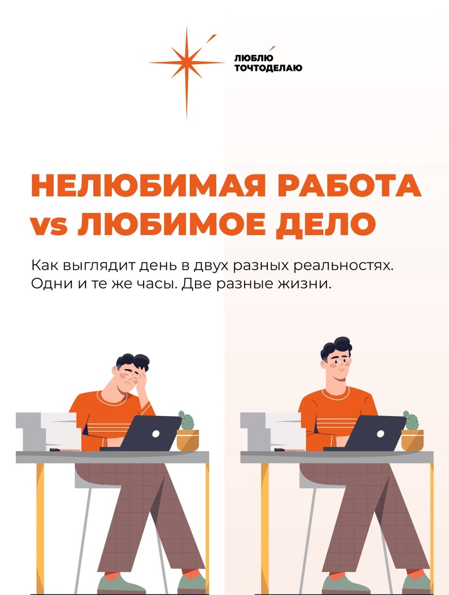 Как выглядит день в двух разных реальностях. Одни и те же часы. Две разные жизни. 7:00 — ПРОБУЖДЕНИЕ Нелюбимая работа: Будильник — как насилие. Первая мысль: «Опять этот понедельник». Пять минут лежите, собираясь с силами. Встаёте через «не могу». Любимое дело: Просыпаетесь до будильника или вовсе без него. Первая мысль: «О, сегодня сделаю то-то!». Энергия бьёт ключом, на сердце радость и предвкушение. 9:00 — НАЧАЛО РАБОТЫ Нелюбимая работа: Третий кофе. Открываете почту — внутри всё сжимается. Задачи чужие, но делать надо. Включаете музыку, чтобы не думать. Любимое дело: Садитесь за работу с интересом. Даже рутина приятна, потому что она — ваша. Музыка не нужна: внутри звучит собственный трек любопытства и игры. 12:00 — СЕРЕДИНА ДНЯ Нелюбимая работа: Постоянно смотрите на часы. «Ещё только 12?». Обед — способ сбежать от стола. Возвращаться не хочется. Любимое дело: «Уже 12? Как быстро!». Обедаете на ходу или забываете про него. Не хочется останавливаться ни на минуту. 15:00 — ПОСЛ