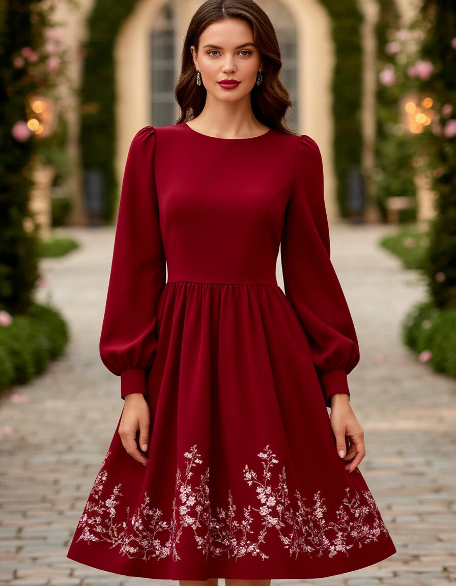 Не просто платье, а воплощение тихой, стильной элегантности. Глубокий цвет спелой вишни, тяжелый, приятный на ощупь шел, струящийся крой. Рукава-фонарики, скромный вырез-лодочка и тончайшая вышивка в виде веточек сакуры по подолу и манжетам. Оно не кричало, оно шептало. Шептало о летних вечерах, о неспешных разговорах при свечах, о женщине, которая знает себе цену и не суетится.