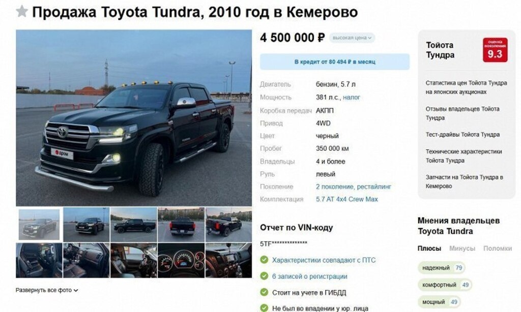🚗 В Кемерово на продажу выставлена уникальная Toyota Tundra 2010 года выпуска с необычной передней частью от Toyota Land Cruiser 200! Этот пикап прошёл серьёзную доработку — полностью заменена передняя часть кузова, что придаёт автомобилю совершенно новый, агрессивный и стильный вид. Пробег автомобиля составляет 350 тысяч километров, что для такого мощного и надёжного двигателя — атмосферного V8 объёмом 5,7 литра и мощностью 381 л.с. — вполне приемлемо. Коробка передач — 6-ступенчатый автомат, обеспечивающий плавное и комфортное переключение скоростей. Салон остался без изменений и соответствует топовой комплектации Platinum: здесь вас ждут премиальная кожа, электроприводы сидений с памятью настроек, раздельный климат-контроль для максимального комфорта, современная медиасистема и панорамный люк, который добавляет ощущение простора и света в салоне. Этот автомобиль — отличный вариант для любителей тюнинга и тех, кто хочет выделиться на дороге. Однако потенциальному покупателю стои
