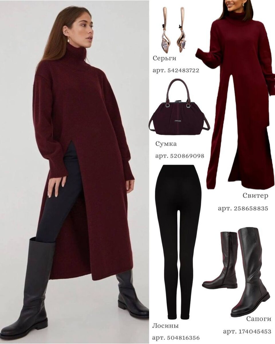 Удлинённый свитер благородного винного оттенка с аккуратным разрезом по бокам, кожаные чёрные леггинсы и высокие минималистичные сапоги. Цвет сразу добавляет настроение и глубину, а гладкие леггинсы и обувь делают силуэт вертикальным и стройным. Получается теплый, уютный и эффектный образ.