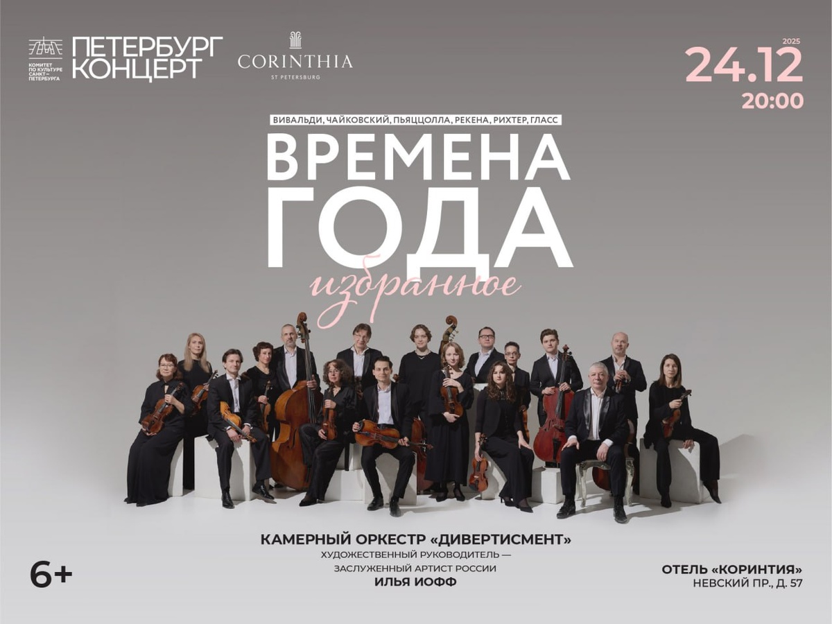 ! Атмосфера Рождества и Нового года вместе с великими композициями Вивальди, Чайковского, Пьяццоллы, Рекены, Рихтера, Гласса заполнит роскошные, празднично украшенные залы нового партнера «Петербург-концерта» — отеля «Коринтия Санкт-Петербург». Камерный оркестр «Дивертисмент» — признанные виртуозы, чье безукоризненное исполнение заставит вас на час с небольшим отвлечься от предпраздничных забот и погрузиться в мир, полный красоты и гармонии. Специальная программа «Времена года. Избранное» познакомит вас с сочинениями величайших мировых композиторов, посвященными философскому созерцанию природы и неустанному течению времени. Художественный руководитель: заслуженный артист России Илья Иофф БИЛЕТЫ: 24.12 | 20:00 | Времена года. Избранное