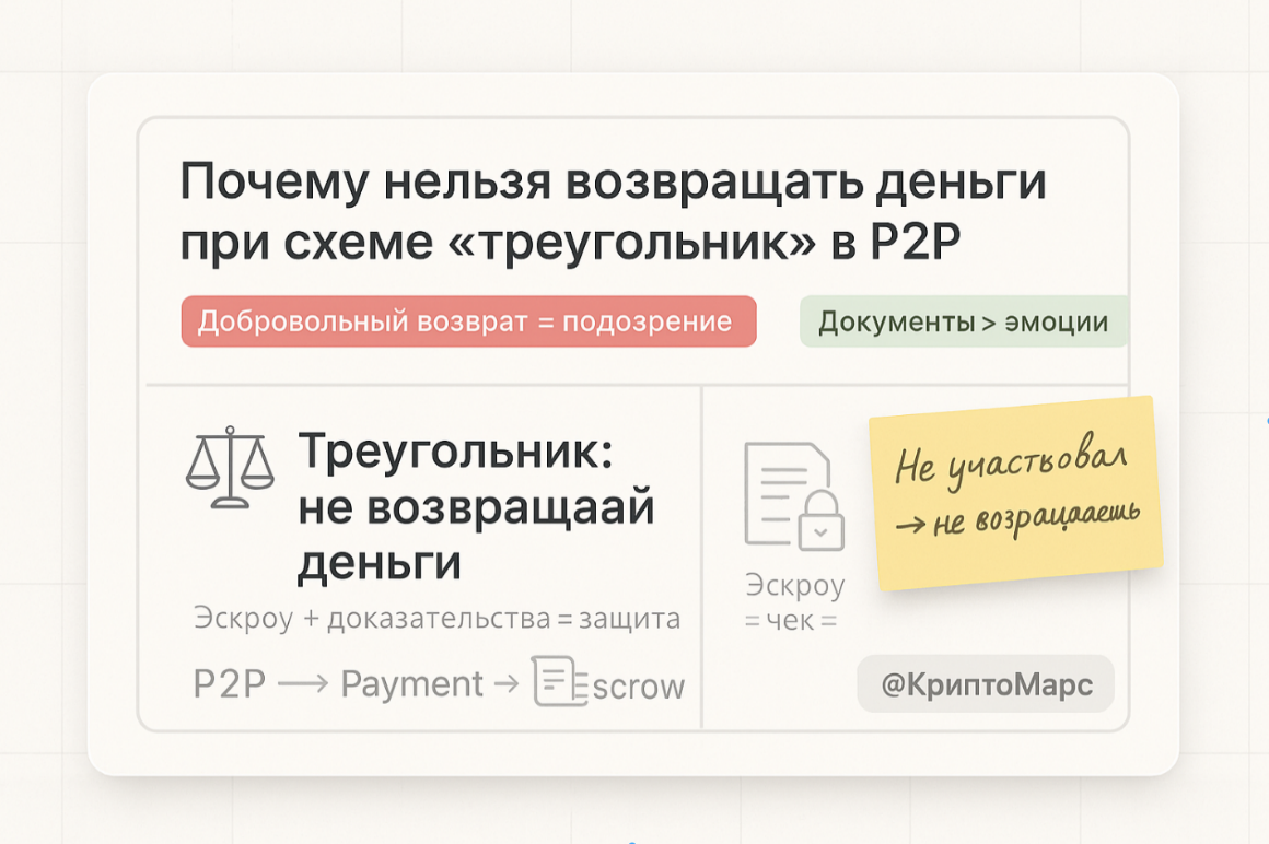 Кажется логичным: вы ведь честный участник рынка, мошеннических действий не совершали, хотите помочь и закрыть вопрос мирно. Но именно этот шаг часто превращает невиновного человека в первого подозреваемого. Не потому что вы сделали что-то плохое, а потому что так устроена логика правоохранительной системы и расследований по платежным мошенничествам. Разберём на понятном примере. Жертва мошенника переводит деньги вам как третьему лицу — это классический «треугольник». Вы, не будучи мошенником, видите ситуацию, возвращаете сумму, берёте расписку — думая, что всё закрыто. Потерпевший идёт в полицию и пишет заявление: «Мне вернули 650 тысяч, но всего украли 2.35 млн». Возбуждается уголовное дело по ст. 159 УК РФ (мошенничество). Первая логика следствия: «Раз человек уже что-то вернул, значит он был участником схемы. Непричаст