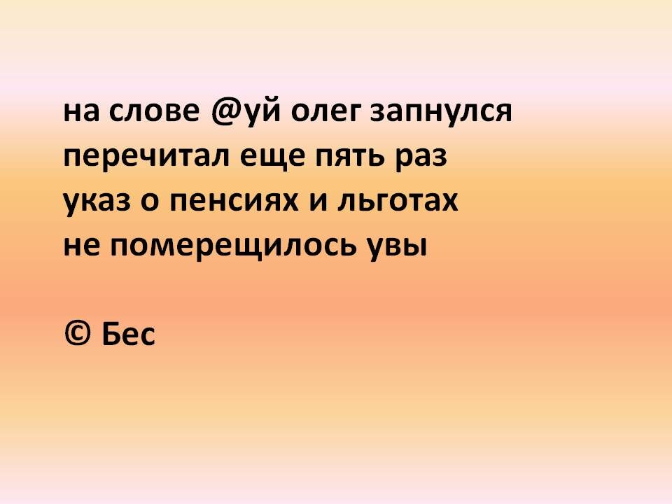 Рассказала ей утром байку, которая, к сожалению, жизнь наша. Бабке 80 с гаком лет, она жила в Мордовии, её перевезли в наш город, а потом она перебралась к дочери, которая живет в Казахстане. И там думала оформляться на их пенсию, но её отговорили, сказали, зачем отказываться от пенсии в РФ, заведите карточку и получайте. Она так и сделала. А пенсионный фонд со временем засомневался в том, что бабка живая. Кому они пенсию начисляют, предъявите! Посоветовали сходить в посольство и там взять справку, и чтобы это посольство официальное письмо отправило в ПФ. Посольство находится далеко от того города, где проживает бабка с дочкой. Съездили. Справку выписали, но отправлять отказались. И теперь один выход – везти бабку в Россию, чтобы пенсию продолжили начислять. То есть надо доказать, что ты живой! И ведь обложились бумажками, людей обложили бумажками, а сами в результате всей этой бумажной волокиты ой, как не уверены. Потому что бюрократическая машина дает сбой, и еще какой! И поэтому они сами себе не веря, не верят и людям, и пожилого человека заставляют гонять туда-сюда. Так и папе моему пришло письмо с ПФ в день его рождения – 20 ноября, чтобы за пенсией приходил, а он 6 мая уже умер.