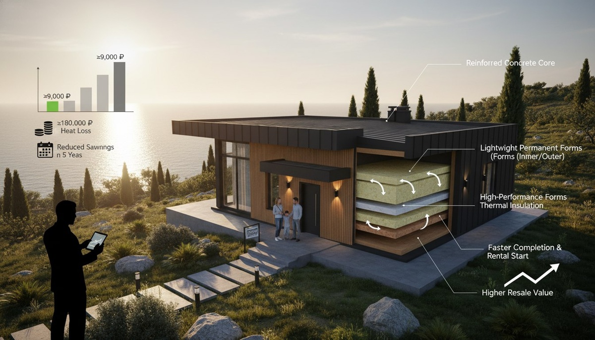 Хотите, чтобы дом в Крыму не просто стоял — а приносил деньги? Мы в Box House строим монолит по технологии SCIP — это не красивая картинка, а точные цифры. SCIP = лёгкие несъёмные панели с ЖБ и утеплителем. Быстрый монтаж сокращает срок от котлована до сдачи — значит раньше стартует аренда. Теплопотери ниже: вместо ~9 000 ₽ в мес — ≈6 000 ₽; за 5 лет — ≈180 000 ₽ экономии. Плюс — выше цена и короче экспозиция при продаже. В сумме инвестор зарабатывает на скорости, низкой эксплуатации и премии рынка. Хотите прикинуть экономику вашего проекта? 🤝🏡