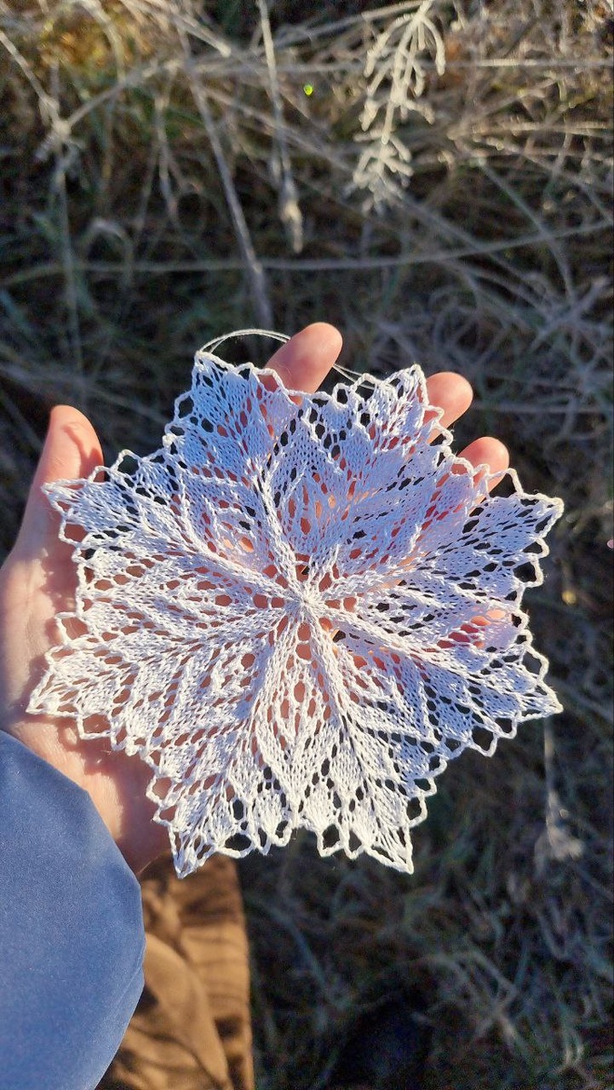 Хочу сегодня поделиться схемой вязания этой красивейшей снежинки спицами! Для вязания снежинки можно взять хлопковую тонкую пряжу, чулочные спицы №2. Чем тоньше пряжа, тем изящнее получится ваша снежинка. Ниже схема вязания снежинки: Внимание! При копировании и публикации моих материалов на других ресурсах указывайте активную ссылку на источник: канал Вязаные Идеи Начинаем вязание с набора 8 петель. Как набрать петли в кольцо смотрите в этом видео: Далее вяжем по схеме с 1 ряда по кругу, повторяя раппорт 8 раз. В четных рядах вяжем лицевыми петлями. Всего нужно провязать по схеме 26 рядов. Когда провязали 26 рядов начинаем вязать крючком арочки из воздушных петель. После того как связали салфетку нужно сделать блокировку, то есть придать ей красивую форму и жесткость. Это можно сделать с помощью крахмала или клея ПВА. Способ блокировки с помощью клея ПВА я показывала в этом видео: Вот такая нежная снежинка получилась у меня по этой схеме Буду рада посмотреть Ваши снежинки, если вос