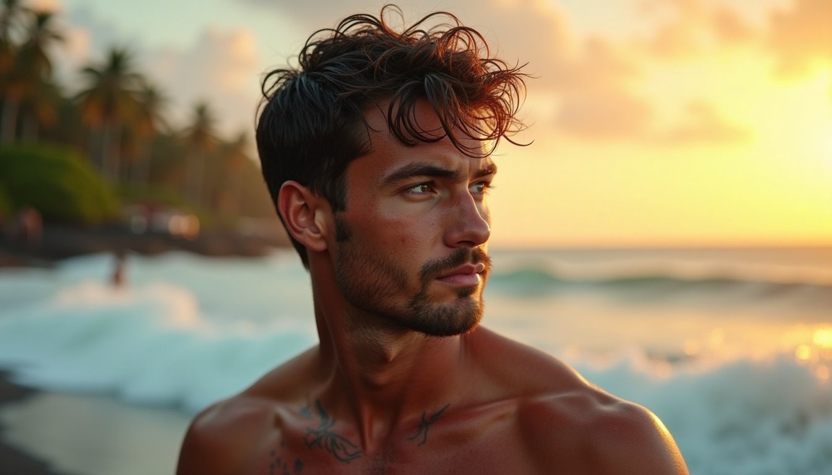 — Эй, новенький! Первый раз на доске пытаешься устоять? — раздался издалека звонкий, чуть грубоватый голос, полный задора и океанского ветра. Незнакомка вынырнула из пены — австралийская серферша с короткой стрижкой, загорелой кожей и дерзким взглядом, что искрился ярче солнца на волнах. Её смех разливался над водой светом, разгоняя любой страх перед бездной. На запястье болталась потрёпанная кожаная тесьма с ракушкой — простая, как её свобода.