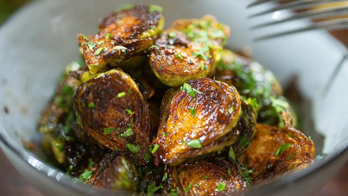 Этот рецепт брюссельской капусты может стать главным гарниром на вашем праздничном столе — будь то Новый год или Рождество! Забудьте о разваренных и безвкусных кочанчиках. Здесь они с хрустящей золотистой корочкой снаружи и нежные внутри, с ярким вкусом бальзамического уксуса, лимона и острого перца чили, а также с тающим во рту сыром Пармезан. Время подготовки — 8 минут, время приготовления 12 минут. Очистите и помойте в чашке с водой брюссельскую капусту. Просушите полотенцем. Разрежьте пополам. В сковороду налейте большое количество оливкового масла. Положите брюссельскую капусту срезом вниз в холодное масло. Готовьте на среднем огне, не переворачивая, 4–5 минут до золотистого цвета (можно слегка встряхнуть сковороду). Переверните и обжарьте другую сторону. Когда подрумянятся, отодвиньте в сторону. Добавьте мелко нарезанные чеснок и чили, перемешивайте в течение 30 секунд, чтобы чеснок равномерно распределился по дну, пока не появится аромат. Добавьте бальзамический уксус и дайте