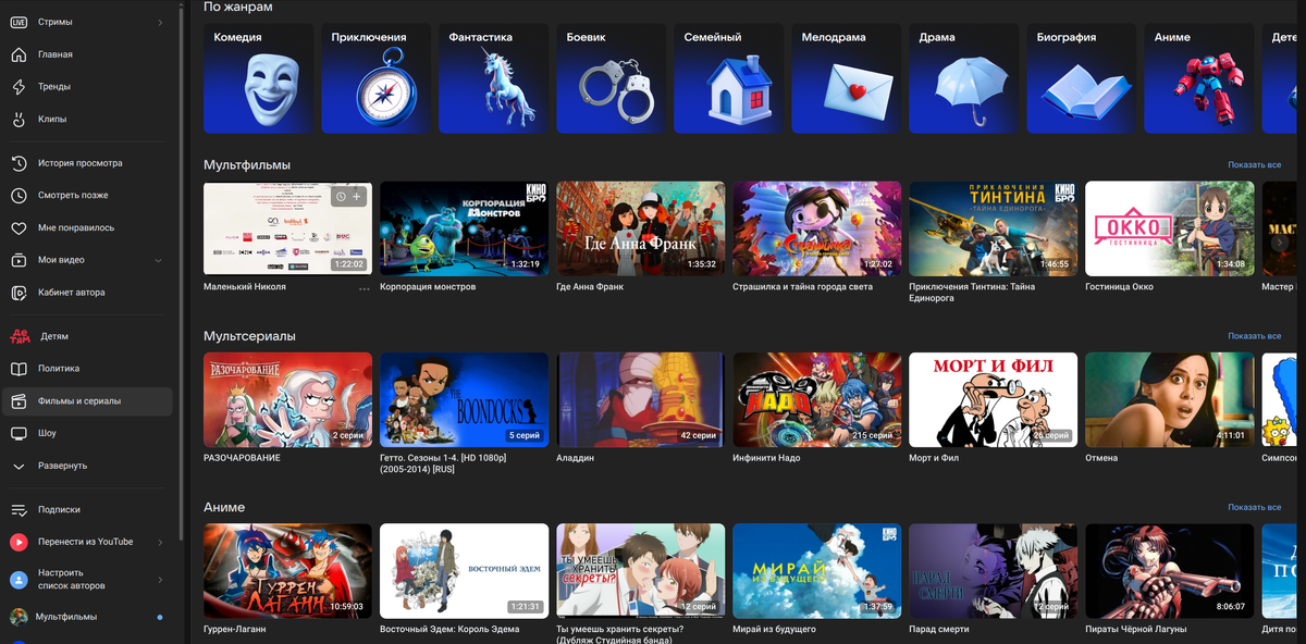 Раздел «Аниме» выделен отдельно, что говорит о растущей популярности японской анимации в России. Фанаты этого жанра получили собственное пространство, где легко находить как классические тайтлы, так и свежие релизы сезона.