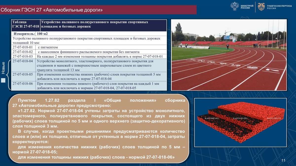 конечно, это не совсем дороги.. Скорее дорожки:) Монолитное литьевое водонепроницаемое бесшовное эластомерное полиуретановое спортивное покрытие (Full Pur) получают в результате холодного отверждения смеси полиуретановой композиции на основе жидких низкомолекулярных каучуков и изоцианатсодержащего отвердителя. Формирование покрытия литьем из предварительно смешенной композиции происходит послойно на твердое основание путем нанесения слоя, как правило 4-6 мм. После нанесения указанного слоя смеси ее поверхность засыпают резиновой крошкой. После отверждения излишне нанесенная резиновая крошка удаляется, и на нее наносится последующий слой таким же образом. Количество наносимых слоев зависит от абсолютной толщины покрытия. Отличительной особенностью верхнего финишного слоя является применение цветного гранулята EPDM для формирования текстурированной поверхности покрытия. Наливные монолитные покрытия лишены недостатков рулонных и обладают более высокой прочностью и долговечностью. Сро