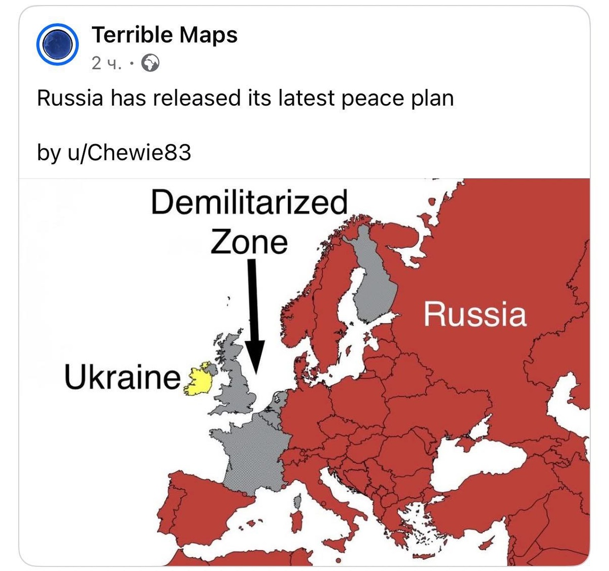 Пиндосы юморят. Россия опубликовала свой мирный план. Красный – территория РФ, серым отмечена демилитаризованная зона. Желтым – Украина. В целом минусов не вижу. Только ирландцев немного жаль. Яблочный Стас