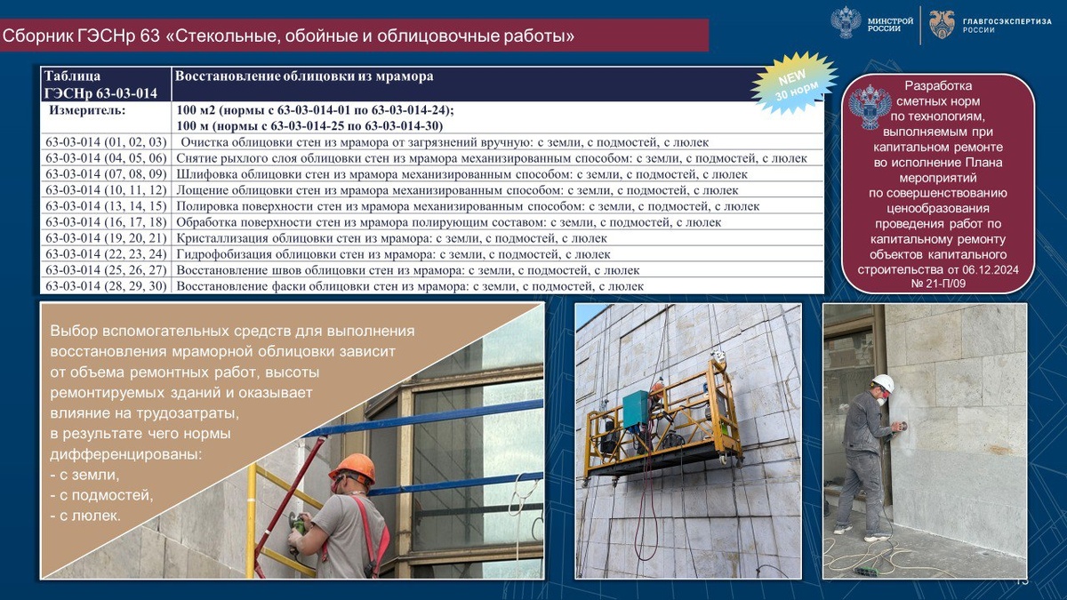 Мрамор – один из видов натуральных камней, востребованный в качестве материала для отделки. Несмотря на то, что мрамор имеет высокую прочность и износостойкость, под воздействием агрессивной среды или интенсивной эксплуатации на поверхности облицовки могут появиться трещины, царапины или сколы. На фасадах также оседает пыль, копоть и солевые отложения. В результате чего возникает необходимость в комплексе работ по восстановлению облицовки стен из мрамора. Хронометраж выполнялся на здании РАН на Ленинском проспекте.