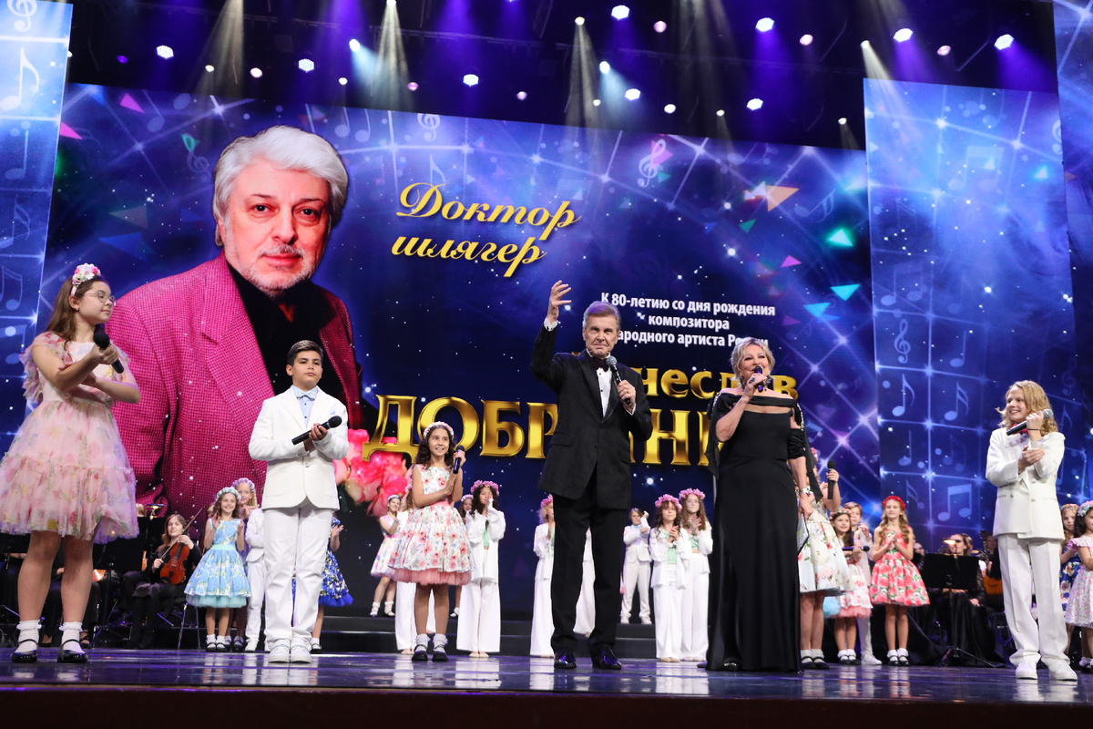 Практически в самом начале концерта его ведущая, заслуженная артистка РФ Татьяна Веденеева, напомнила: Вячеслав Григорьевич Добрынин написал более 1000 песен, и большинство из них стали поистине всенародными хитами. В 1970-е-1990-е они звучали на всех теле- и радиоканалах, без них не обходились дискотеки и домашние праздники. Тенденция сохранилась и в нулевые, и после того, как минуло первое десятилетие уже XXI века. И сегодня, стоит лишь зазвучать какой-либо из позитивных мелодий Вячеслава Добрынина, как настроение мгновенно улучшается, появляется уверенность в собственных силах, и вот ты уже не сомневаешься: всё сложится, а песня тебя непременно поддержит. Даже, казалось бы, грустные композиции о любви у композитора всегда получались необычайно светлыми, а потому его музыка дарит надежду на счастье каждому. Конечно же, с самого начала она пришлась по душе слушателям! Коллеги и журналисты почтительно величали Добрынина маэстро отечественной эстрады, а ещё Вячеслав Григорьевич был известен как «Доктор Шлягер» – так его называли за невероятную способность буквально на ходу сочинять музыку на все времена.