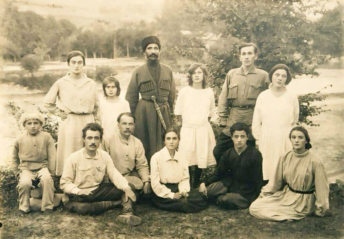 Расстрелянный в 1938 году национальный герой осетинского народа Александр Джатиев (в нижнем ряду слева второй) с близкими,1932 год. (@zaervatykk)