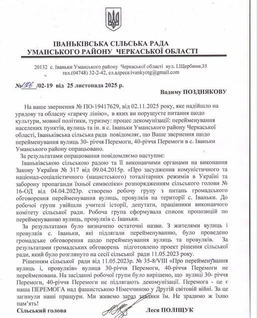 На Укр-не после 2014 года проводится политика декоммунизации. Все улицы, города и т.п., которые так или иначе названы в честь российских или советских деятелей признаны империалистическими и для свободной и демократической страны неприемлемы. Этот закон потребовал огромных финансовых вложений, но "незалежная" страна нашла эти деньги у европейцев, которые финансировали любые русоф.обские проекты. Конечно деньги давали в кредит, но укр-кие власти всегда брали деньги вперед, т.к. обычно долги отдавали уже другие политики, которые приходили потом к власти. НО! Не все так плохо на Ук-не. Там еще остались люди, для которых прошлое является их историей и они её ценят. Так Иваньковская громада Черкасской области написала чиновникам из центральной власти-деколонизаторам, что ОТКАЗЫВАЕТСЯ переименовывать улицы, названные в честь Победы над на.циз.мом. Они написали, что это ИХ ПОБЕДА над нац.ист.ской Германией, за которую по.ги.бли ИХ предки. И мы живем сегодня благодаря их жертве. Поэтому не
