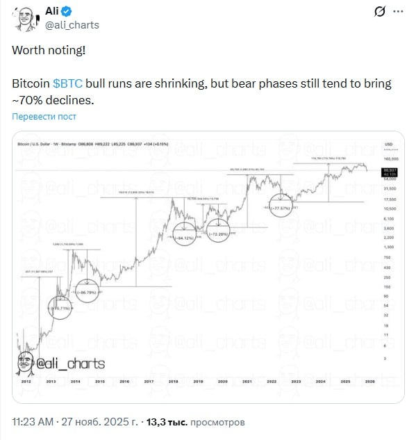 Бычьи ралли биткоина становятся короче, однако медвежьи фазы по-прежнему приводят к падениям примерно на ~70