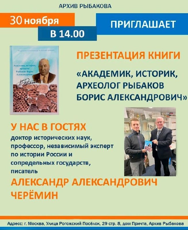 Друзья, Приглашаю! 30 ноября в 14:00 Москва ул. Рогожский Посёлок д.29 стр. 8 Состоится презентация моей новой книги «Академик, историк, археолог Рыбаков Борис Александрович». На презентации книги будет рассказано об истории и археологии, как науках в Российской империи, СССР и РФ. Освещена полная биография выдающегося учёного Бориса Александровича Рыбакова. Книга создавалась 5 лет. Хранитель архива Первов Святослав Юрьевич. Научный руководитель архива Черёмин Александр Александрович. Ждем Вас!
