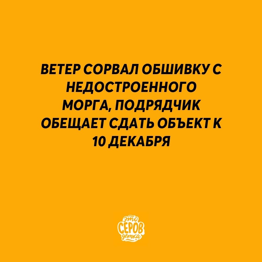 ❗️ Ветер сорвал обшивку с недостроенного морга в Серове, подрядчик обещает сдать объект к 10 декабря. Верите в это? На недостроенном здании морга в Серове сильным ветром сорвало несколько листов фасадной обшивки. Прорехи образовались над тремя окнами, а сами панели валяются на земле. Строители, работающие на объекте, пояснили, что материал не был должным образом закреплен из-за ожидания утепления чердака. Представитель подрядчика Сергей Назаров заверил, что материал для восстановления фасада имеется, и объект планируется сдать к 10 декабря. По его словам, осталось постелить линолеум и завершить отделку фасада. Работы по монтажу вентиляции, которые выполняются специалистами из Нижнего Тагила, близки к завершению. Строительство модульного морга ведется с отставанием от графика — первоначально его планировалось сдать в ноябре 2024 года. Старый морг в Серове был закрыт из-за аварийного состояния здания, что вынуждает транспортировать тела умерших в морг Краснотурьинска.