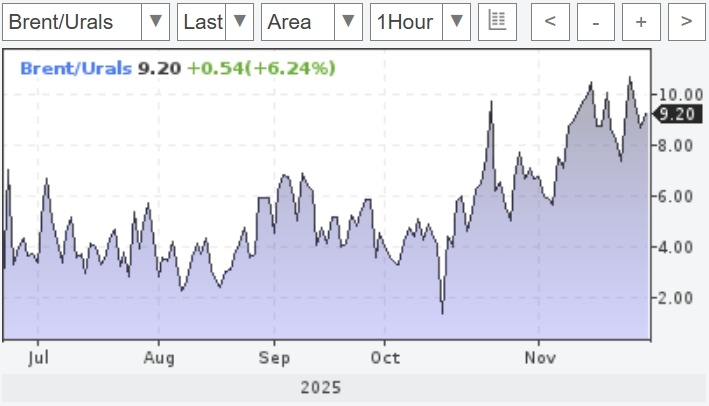 В ноябре скидка на нефть марки Urals по отношению к Brent составила 23%. При этом в октябре добыча нефти в России увеличилась до 9,38 млн баррелей в сутки. График соотношения нефти марок Brent/Urals интервалами в 4 часа В этом месяце скидка на российскую нефть марки Urals по отношению к мировому эталонному сорту Brent увеличилась на 6 процентных пунктов и достигла 23%, согласно сообщению Центрального банка России в его последнем обзоре. Эти скидки, хотя и не такие значительные, как после первой волны западных санкций в 2022 году, свидетельствуют о растущем давлении на доходы от нефти, которые являются ключевым источником финансирования для российского бюджета. В предыдущем месяце Соединённые Штаты ввели строгие ограничения против крупных российских нефтяных компаний, таких как «Лукойл» и «Роснефть». Центральный банк отметил, что скидка на нефть составляла около 15% во втором и третьем кварталах, увеличившись до 17% в октябре. Reuters прогнозирует, что доходы России от нефти и газа могу