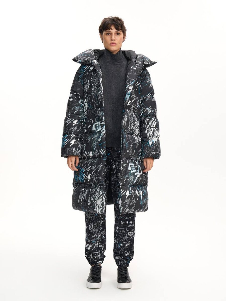 Пуховик FIRST IN SPACE универсальной средней длины с модными принтами