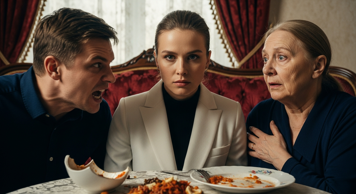 Грохот был оглушительным. Салат оливье разлетелся по ковру, щи растеклись жирной лужей, осколки хрустнули под ногами.