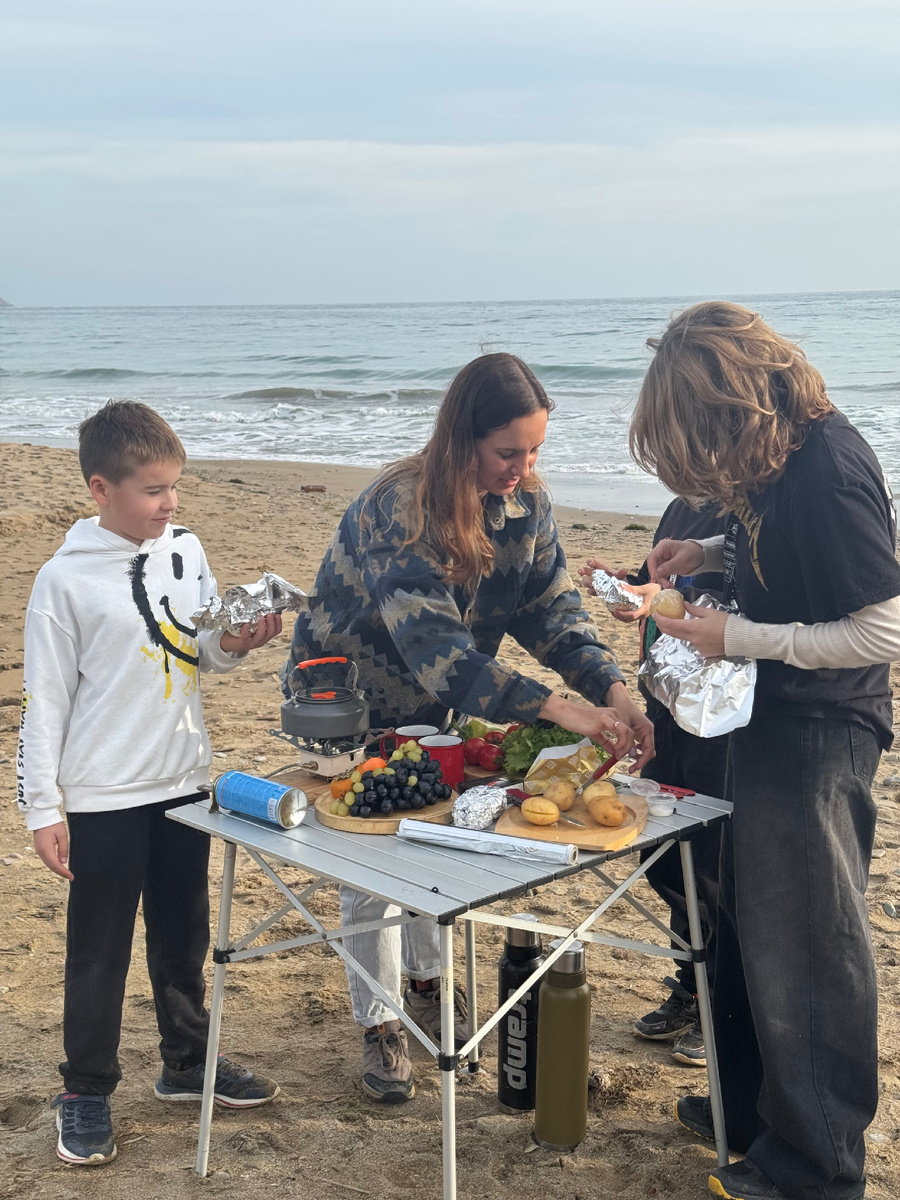 Детям очень понравилась идея именно так провести теплые осенние выходные. Солнечный ноябрь очень располагал к посиделкам на природе. Когда мы были детьми, родители часто устраивали для нас такие пикники. А сейчас мы перенесли эту традицию в свою семью. Вместе с ребятами отправились на берег моря готовить походные рецепты из нашего детства. Выбрали уютную Тихую бухту, взяли наш небольшой мангал, угли. С удовольствием делимся нашими рецептами с вами. • Картофель в фольге с сливочным маслом на углях Ингредиенты: - молодой картофель (целый, среднего размера) - сливочное масло GOLDEN RICH - соль, перец - фольга Как готовить: 1. Картофель хорошо вымыть, можно не чистить. 2. Каждый клубень слегка надрезать крест-накрест не до конца. 3. В надрез положить кусочек сливочного масла, немного соли, перца 4. Плотно завернуть в фольгу. 5. На природе положить в угли или на решетку мангала, запекать ~30–40 минут, периодически переворачивая. К запеченному картофелю на углях добавляем вкусные б