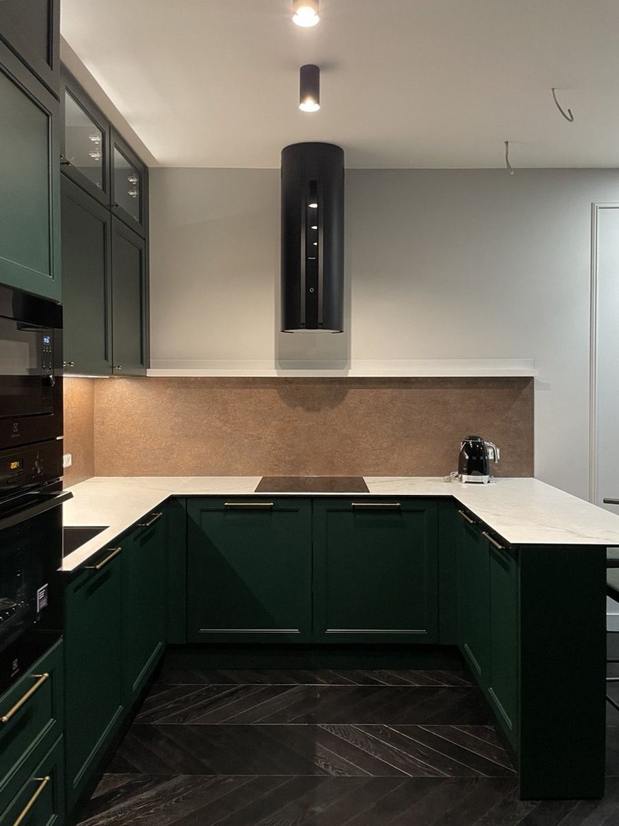 Непростые и необычные проекты, технически и визуально. Все больше и больше именно таких у нас. Здесь кухня – это целый микс из разных стилей, форм, фактур и материалов. Фрезеровка фасадов неоклассика, глубокий тяжелый оттенок зеленого, пристенок с имитацией металла бронза, компакт плита под мрамор, белая металлическая полочка из тонкого металла вместо верхних шкафов. Работали по уже готовому проекту от студии интерьера. Но внесли изменения – новые пожелания заказчика, технические особенности, плюс добавили недостающий функционал (например ящички под столовые приборы). Сделали новый виз проекта. Интересные моменты: (продолжение ниже) #тЫквинЛес #кухня #мебель