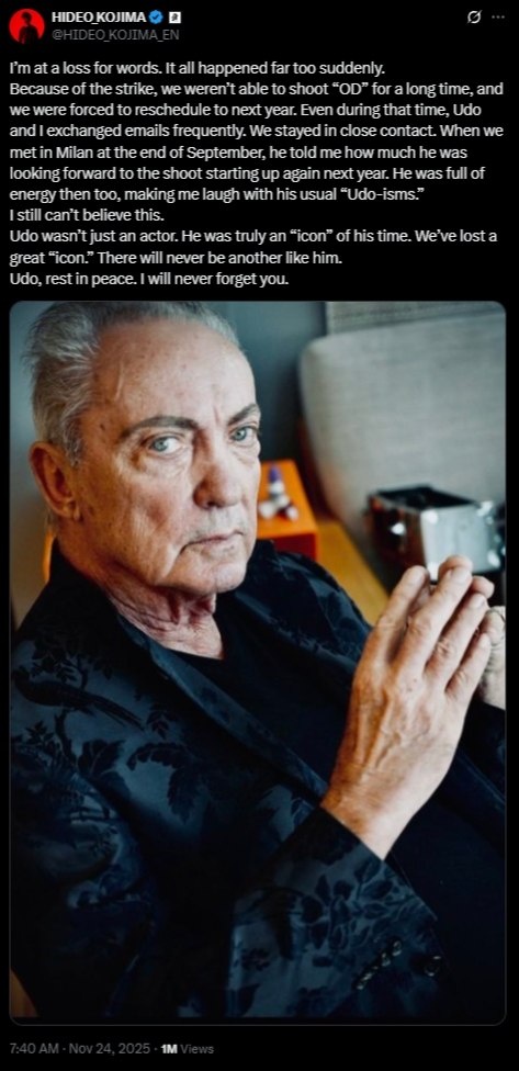 На 82 году жизни нас покинул немецкий актёр Удо Кир. Удо Кир (Udo Kier) — культовый немецкий актёр, чья карьера охватывала более пяти десятилетий. Он снялся в огромном количестве фильмов, зарекомендовав себя как мастер ярких, зачастую эксцентричных и запоминающихся ролей в авторском и жанровом кино. Удо снимался в фильмах от "Джонни Мнемоника" и "Блейда", до такого авторского кино как "Раскрашенная Птица" сделанного по роману Ежи Косинского. Для игрового сообщества он особенно запомнился как Юрий в стратегии Command & Conquer: Red Alert 2 (2000) и её дополнении Yuri’s Revenge (2001). Его харизматичное исполнение и узнаваемый облик сделали этого персонажа одним из самых культовых в истории серии. Также известно, что Удо Кир был приглашён к участию в проекте OD Knock легендарного геймдизайнера Хидео Кодзимы. Премьера игры планировалась в 2026 году, и участие Кира обещало стать заметной частью этого амбициозного замысла. К сожалению, этому уже не суждено сбы Показать полностью... Dail