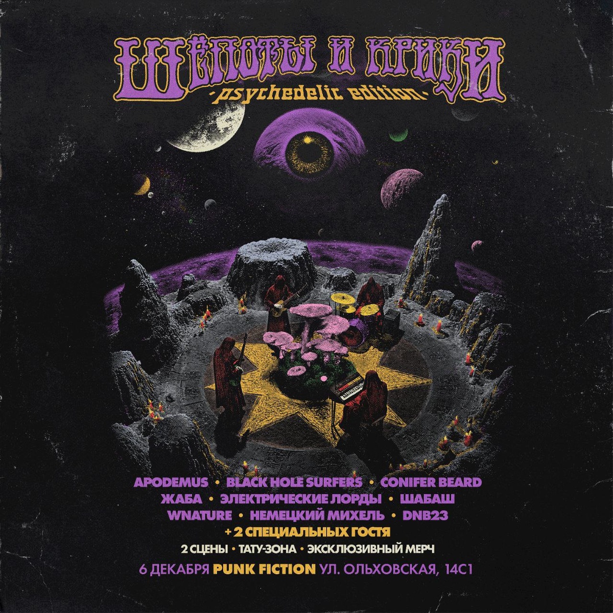 Москва ● Punk Fiction ● 06.12 (Сб) ● 18:00 #psychedelic #rock #stoner ► ШЕПОТЫ И КРИКИ ● TG ● VK Растворись в потоке, где исчезает всё лишнее и остаётся лишь истина. Все произойдет так, как должно. Переживи, чтобы понять, что скрыто внутри. Участники: ► Apodemus ● VK ► Conifer Beard ● TG ● VK ► Black Hole Surfers ● TG ● VK ► Электрические Лорды ● TG ● VK ► Жаба ● TG ● VK ► Dnb23 ● TG ● VK ► Wnature ● TG ● VK ► Шабаш ● TG ● VK ► Немецкий Михель ● TG ● VK Билеты от 800₽ Скидка для подписчиков ► PSYCH