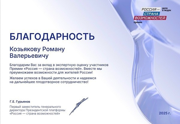 Π½Π°ΡΠΊ, Π΄ΠΎΡΠ΅Π½Ρ ΠΠΎΠ·ΡΡΠΊΠΎΠ² Π ΠΎΠΌΠ°Π½ ΠΠ°Π»Π΅ΡΡΠ΅Π²ΠΈΡ Π±ΡΠ» ΡΠ΄ΠΎΡΡΠΎΠ΅Π½ ΠΠ»Π°Π³ΠΎΠ΄Π°ΡΠ½ΠΎΡΡΠΈ Π·Π° Π·Π½Π°ΡΠΈΡΠ΅Π»ΡΠ½ΡΠΉ Π²ΠΊΠ»Π°Π΄ Π² ΡΠΊΡΠΏΠ΅ΡΡΠ½ΡΡ ΠΎΡΠ΅Π½ΠΊΡ ΡΡΠ°ΡΡΠ½ΠΈΠΊΠΎΠ² ΠΡΠ΅ΠΌΠΈΠΈ Β«Π ΠΎΡΡΠΈΡ β ΡΡΡΠ°Π½Π° Π²ΠΎΠ·ΠΌΠΎΠΆΠ½ΠΎΡΡΠ΅ΠΉΒ». ΠΡΠ° Π½Π°Π³ΡΠ°Π΄Π° ΡΠ²Π»ΡΠ΅ΡΡΡ ΡΠ²ΠΈΠ΄Π΅ΡΠ΅Π»ΡΡΡΠ²ΠΎΠΌ Π²ΡΡΠΎΠΊΠΎΠ³ΠΎ ΠΏΡΠΎΡΠ΅ΡΡΠΈΠΎΠ½Π°Π»ΠΈΠ·ΠΌΠ° Π ΠΎΠΌΠ°Π½Π° ΠΠ°Π»Π΅ΡΡΠ΅Π²ΠΈΡΠ°, Π΅Π³ΠΎ Π³Π»ΡΠ±ΠΎΠΊΠΈΡ