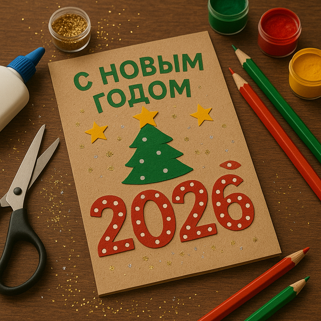 Небольшая, практичная и понятная инструкция для родителей и детей Новогодняя открытка — это не просто сувенир. Это маленький знак внимания, который ребёнок делает сам: вкладывает в него настроение, фантазию и частичку семейного тепла. А совместный мастер-класс — отличный повод собраться за столом, отключиться от гаджетов и провести час в приятном творческом общении. Что понадобится: плотная бумага или картон (белый или цветной) цветные карандаши, фломастеры или акварель ножницы клей-карандаш блёстки, наклейки, ленточки — по желанию простой карандаш и ластик Важно: с малышами безопаснее использовать клей-карандаш и ножницы с закруглёнными краями. ШАГ 1: Основу открытки делаем за 2 минуты Сложите лист пополам — это и будет форма открытки. Чтобы сгиб был ровным, можно провести по линии линейкой или непишущей ручкой. 🕯️Совет: детям помогает «метод книжки» — сказать, что открытка должна складываться как любимая книжка, это упрощает объяснение. ШАГ 2: Рисуем главный символ — цифры 2026 Ес