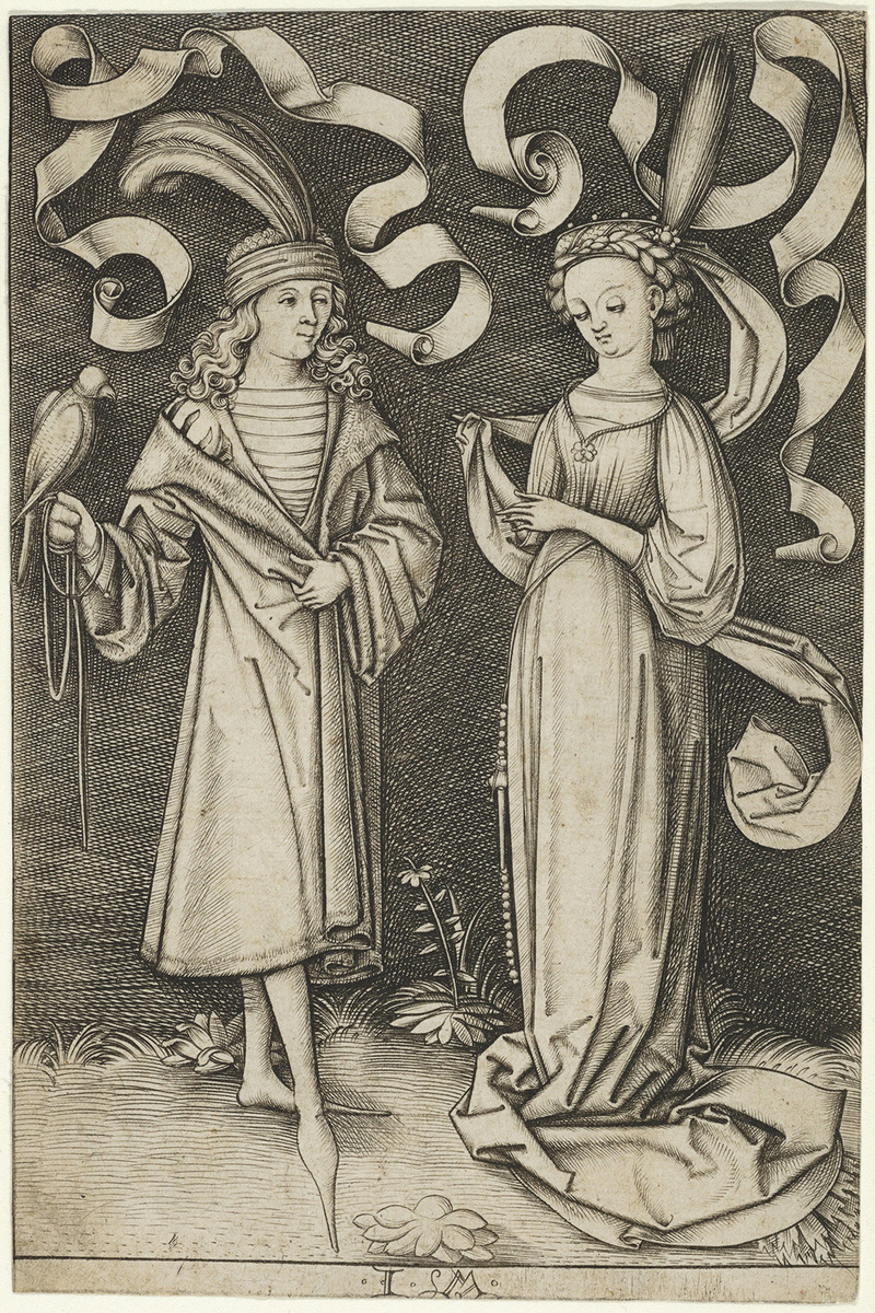 Это изображение куртуазной любви – самое изысканное в серии гравюр Исраэля ван Мекенена (1440/4-1503), посвящённых любовным отношениям, от рыцарских до сладострастных, между разными сословиями. В изобразительном искусстве XV века благородное развлечение – соколиная охота – традиционно ассоциировалось с любовью. На этой гравюре сокол сидит на руке в перчатке элегантно одетого жениха. Пока его возлюбленная скромно смотрит вниз, он украдкой бросает на неё взгляд. Из её головного убора развевается ткань, вторя развевающимся над парой лентам. Такие воздушные ленты часто изображали диалог между фигурами; здесь они, возможно, оставались пустыми, чтобы заказчик смог самостоятельно их заполнить. Ван Мекенен, практикующий ювелир, был также одним из самых плодовитых и новаторских мастеров XV века в смежном искусстве гравюры. Хотя значительная часть его творчества состоит из копий работ других гравёров, многие из его поздних работ, например, серия «Сцены повседневной жизни», представляли со