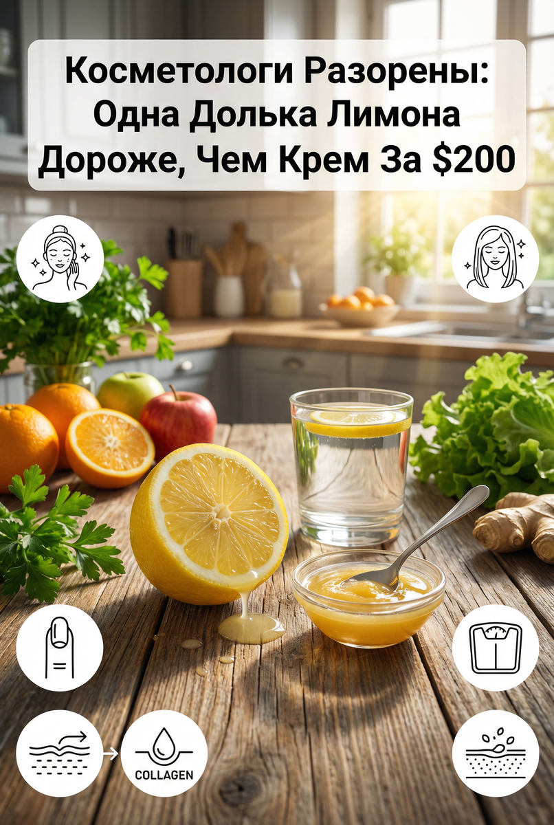 Привет! сегодня я расскажу вам о маленьком жёлтом фрукте, который косметическая индустрия боится больше, чем потери клиентов. Речь идет о лимоне - естественной системе омоложения, которая дешевле одного визита к косметологу. В одном лимоне содержится 25-40 мг витамина С - это 40-70% суточной потребности в природной, легко усваиваемой форме. Вот что происходит, когда витамин С попадает в организм женщины: Стимулирует коллаген. После 30 лет производство коллагена падает на 1% в год. Витамин С включает этот процесс в обратном направлении, буквально подтягивая кожу изнутри. Результат? Морщины исчезают, лицо становится упругим и молодым. Уничтожает свободные радикалы - враги молодости. Это как найти супер-уборщика для вашего организма. За месяц вы увидите, как кожа светлеет, морщины уменьшаются, а лицо светится здоровьем. Осветляет пигментные пятна. Витамин С блокирует меланин, поэтому возрастные пятна постепенно светлеют. Это дешевле лазера в 100 раз. Лимонная кислота - это нежный химическ