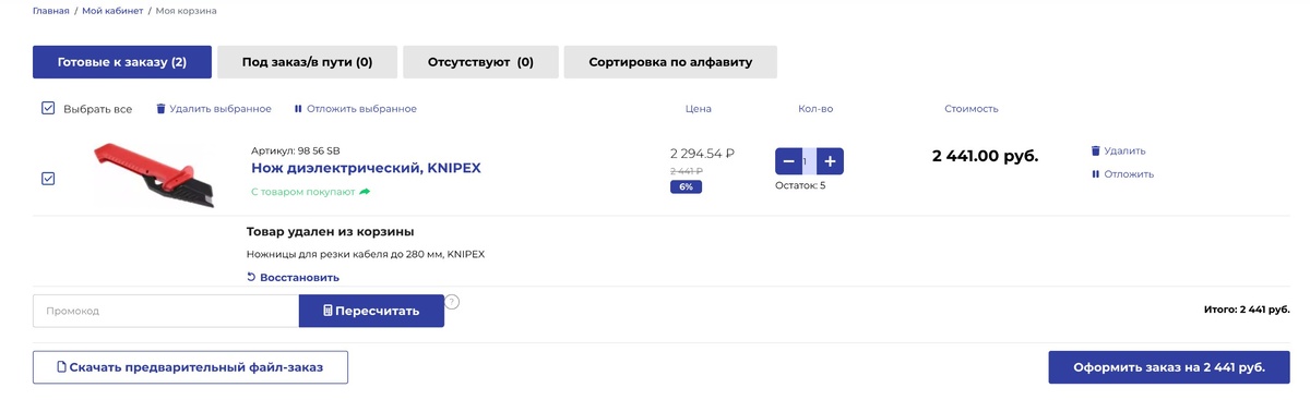 Для интернет-магазина «Электроцентр» доработали корзину, добавив возможность восстановить удаленный товар.