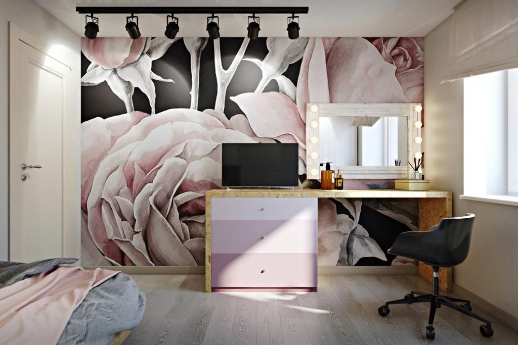Нежнее нежного. Интерьер этой комнаты, был создан для молодой девушки. В нем использована интересная палитра, сочетающая черный с оттенками розового. Выполнена на заказ экспериментальная мебель из ОСП под глянцевым лаком. С помощью прожекторов и софитов, создан антураж съемочной площадки. Проект - #АЧ_Функциональный_Аспект