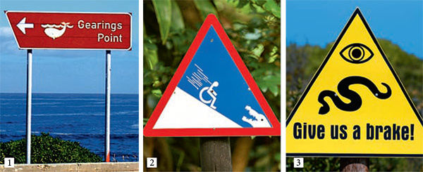 Знаки №2 и №3: «Осторожно, крокодилы на спуске» и «Змеи на проезжей части»