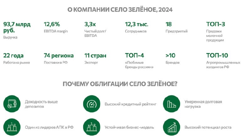 Новый выпуск от Село Зеленое – доходность до 19,56% и ставка на стабильный агросектор Рынок корпоративных облигаций продолжает смещаться в сторону эмитентов реального сектора, и появление нового выпуска от Село Зеленое Холдинг, который хорошо вписывается в этот тренд. Для инвесторов, которые ищут сочетание доходности, понятного бизнеса и рейтинга уровня “A”, история выглядит достаточно интересной. ➖Параметры нового размещения ▪️Объем: 2 млрд рублей ▪️Купон: не выше 18,00% годовых (YTM – до 19,56%) ▪️Срок обращения: 2 года ▪️Купонный период: 30 дней ▪️Сбор заявок: 02 декабря 2025 г ▪️Размещение: 05 декабря 2025 г ▪️Рейтинги: A.ru от НКР и Aru от НРА Ориентир по доходности ощутимо превышает ставки по депозитам и выглядит конкурентно относительно аналогичных выпусков в реальном секторе. ➖О компании Село Зеленое – структура, объединяющая активы бренда Село Зеленое и ключевые направления “КОМОС ГРУПП”. Сам агрохолдинг входит в ТОП-10 АПК России, работает через 23 предприятия, поставляет