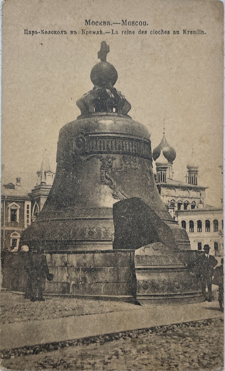 У меня есть архивная подборка фотографий и открыток одной петербургской семьи. Семья была довольно большой и активно путешествующей, судя по географии. Где они только не бывали: то Выборг, то Рига, Астрахань, Владивосток, Кавказ, потом вдруг, раз, и карточка из Рима. И на каждой открытке от этих путешественников я читаю удивительно тёплые приветы тем, кто оставался и ждёт их дома на Фонтанке, 144, кв. 251/252. Не знаю, почему наследники не сохранили этот архив и решили расстаться с ним. Но я не жалею, что выкупила, иногда достаю эти открытки, читаю короткие и трогательные пожелания и думаю о людях, которые уже давно нет, но в этих строках они будто продолжают говорить. Сегодня у меня в руках дореволюционная открытка с видом Царь-колокола в Кремле. Формат привычный для начала ХХ века: лаконичная фототипия, без художественных добавок, с хорошей проработкой деталей. Подписи на лицевой стороне: — Москва — Moscou — Царь-Колоколъ въ Кремле — La reine des cloches au Kremlin Подписи на обо