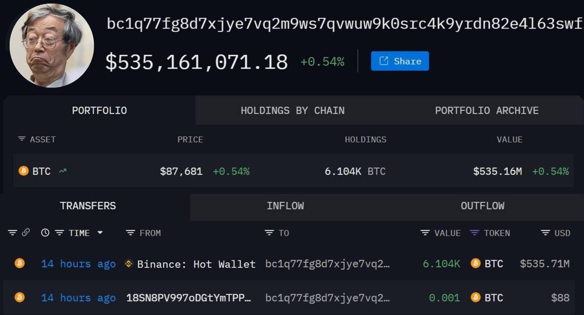 Кит эпохи Сатоши только что купил 6104 #BTC на сумму более чем 535 млн