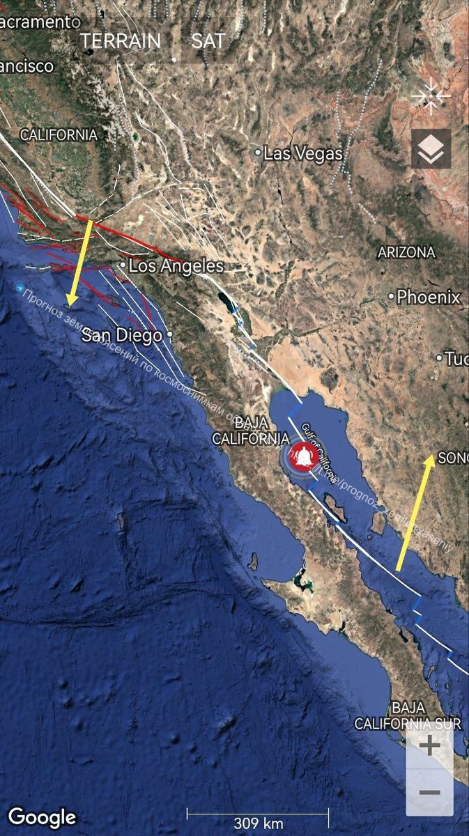 Для Калифорнии имеется вероятность землетрясения с магнитудой до М7.4+/-0.2 до 7 декабря. Трассируется разлом Сан-Андреас на участке от Калифорнийского залива до Л.А. с поворотом облачной проекции против часовой стрелки. ====== For California, there is a probability of an earthquake with a magnitude up to M7.4+/-0.2 before December 7. The San Andreas fault is traced from the Gulf of California to L.A. with a counterclockwise rotation of the cloud projection.